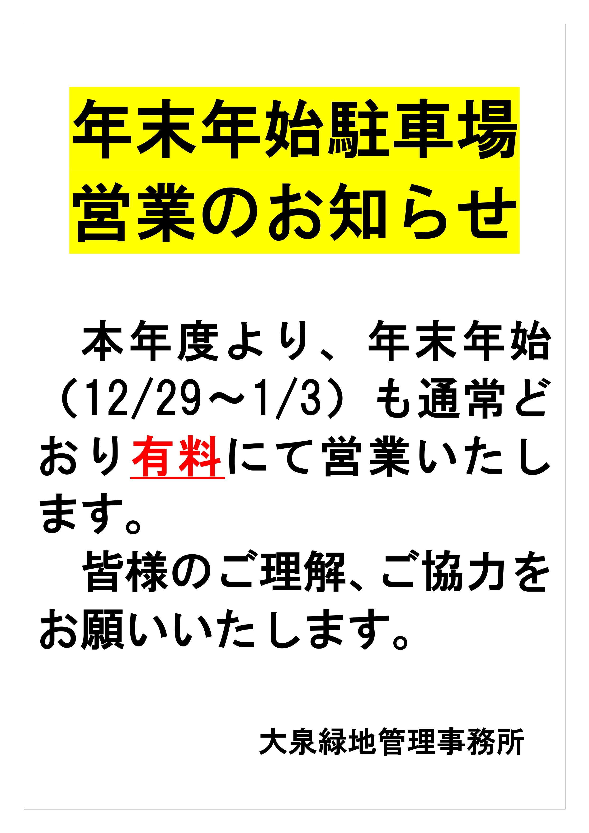 【年末年始駐車場営業のお知らせ】