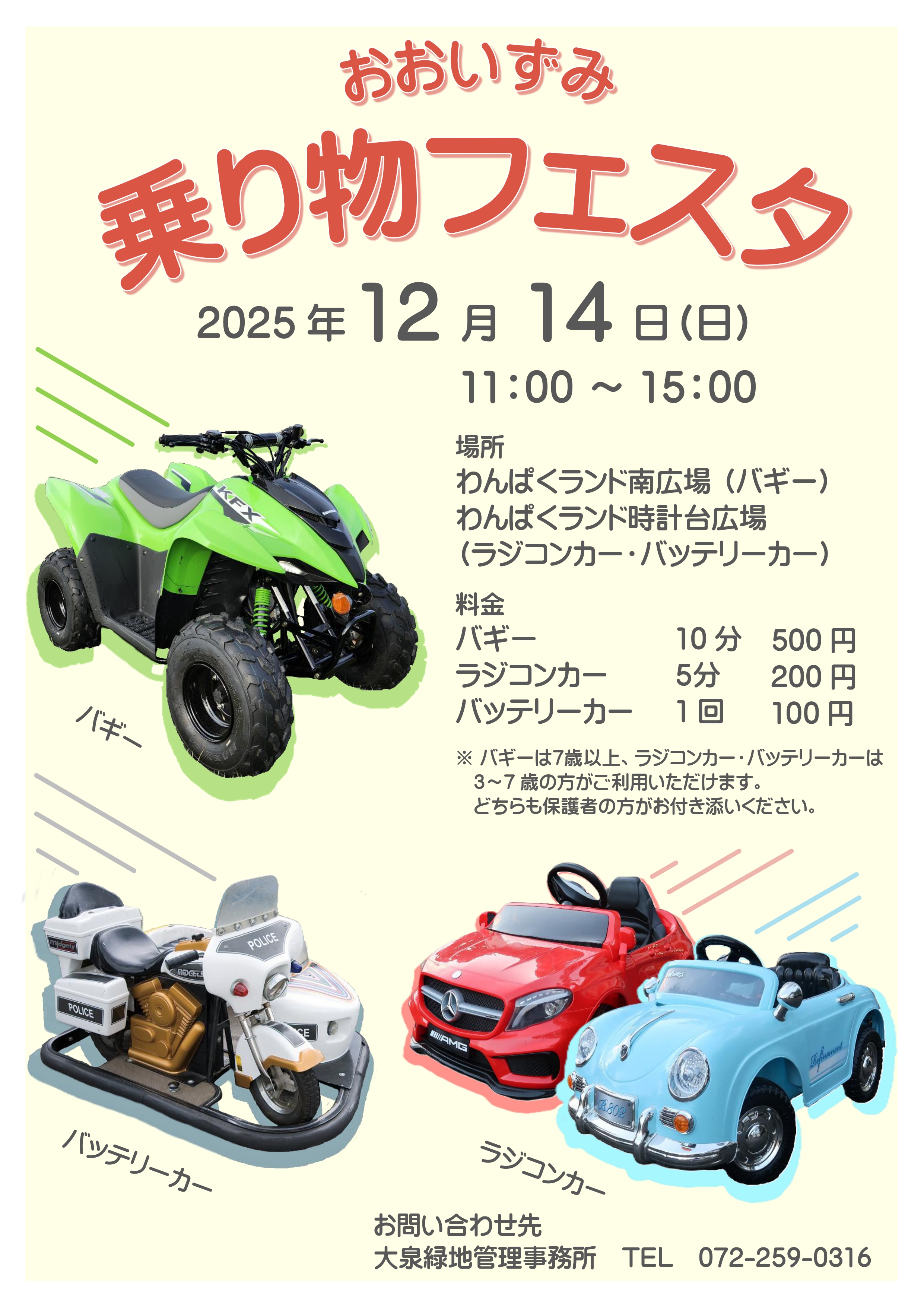 場所:わんぱくランド 南広場(バギー)、時計台広場(ラジコンカー、バッテリーカー)